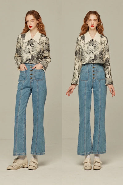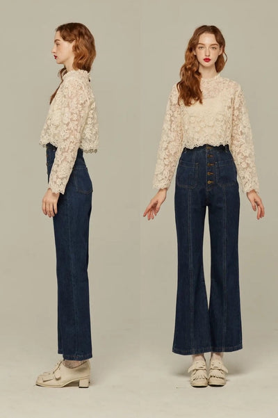 《お風呂に入りながら歌うアニー》ハイウエストフロントボタンデニムパンツ-Blue