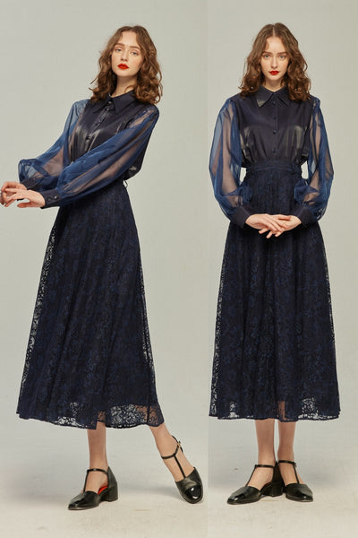 《100年も前からある》ハイウエストフレアレーススカート-Navy